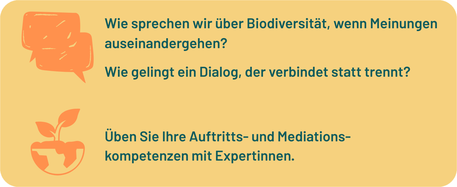 In unserem praxisnahen Kurs lernen Sie, wie Sie wertschätzend, überzeugend und dialogfähig über Biodiversität kommunizieren – auch mit Menschen, die andere Perspektiven vertreten. Sie entwickeln Ihre persönliche Auftrittskompetenz, üben den Umgang mit kritischen Fragen und stärken Ihre Fähigkeit, Brücken zwischen unterschiedlichen Sichtweisen zu bauen.