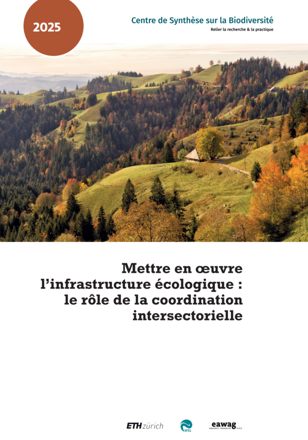 Camichel A, Haller S, Richman S, Pärli R, Widmer A, Ammann J, Baumann E, Berger S, Bühler C, Dajcar N, Donati G, Finkenbrink B, Fischer C, Fischer M, Fontana S, Gimmi U, Indermühle N, Käch H, Keller D, Keller R, Klein N, Landolt J, Lichtenthäler G, Marti F, Oehri J, Ruthishauser E, Salminen J, Schmidt B, Schwab Cammarano S, Wegscheider B, Widmer I, Wüest Karpati R, Lieberherr E. (2025) Mettre en œuvre l’infrastructure écologique : le rôle de la coordination intersectorielle. Centre de synthèse sur la biodiversité . doi.org/10.3929/ethz-c-000785369