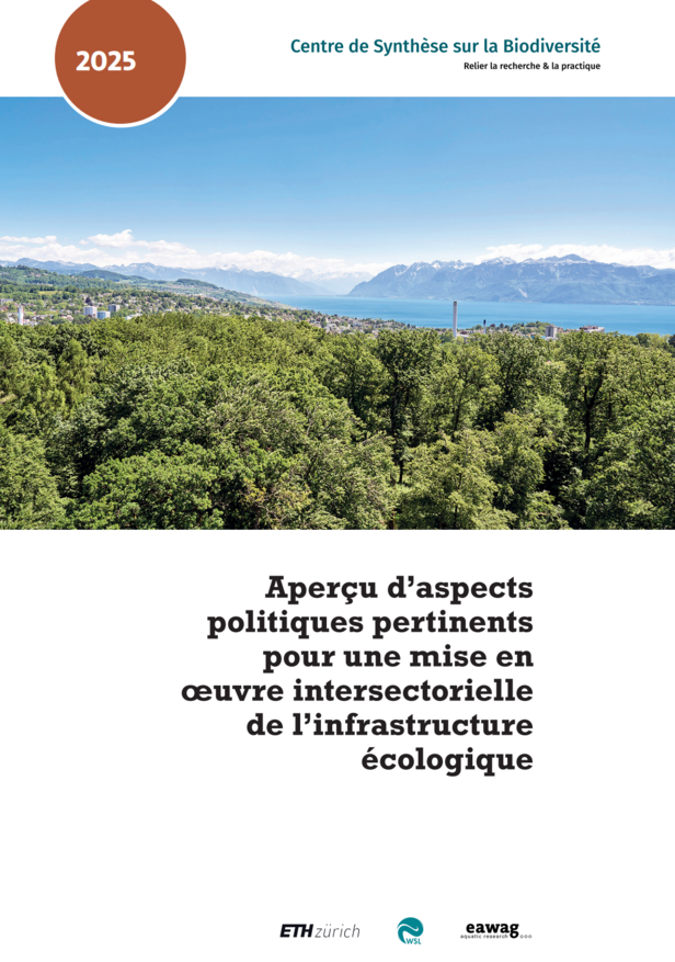 Camichel A, Richman S, Pärli R, Widmer A, Ammann J, Baumann E, Berger S, Bühler C, Dajcar N, Donati G, Finkenbrink B, Fischer C, Fischer M, Fontana S, Gimmi U, Indermühle N, Käch H, Keller D, Keller R, Klein N, Landolt J, Lichtenthäler G, Marti F, Oehri J, Ruthishauser E, Salminen J, Schmidt B, Schwab Cammarano S, Wegscheider B, Widmer I, Wüest Karpati R, Lieberherr E (2025) Aperçu d’aspects politiques pertinents pour une mise en œuvre intersectorielle de l’infrastructure écologique. Centre de synthèse sur la biodiversité. doi.org/10.3929/ethz-c-000785368